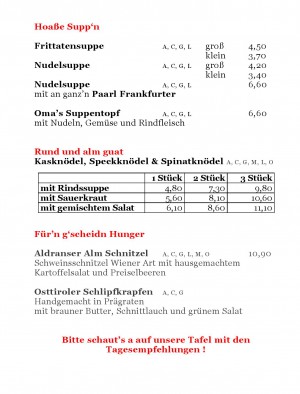Aktuelle Speisekarte von Aldranser Alm in Aldrans
