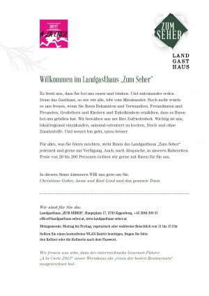 Ausgezeichnet von A la carte, Slow Food Guide 2017 und Falstaff Guide 2017 mit 80 Punkten und einer Gabel.