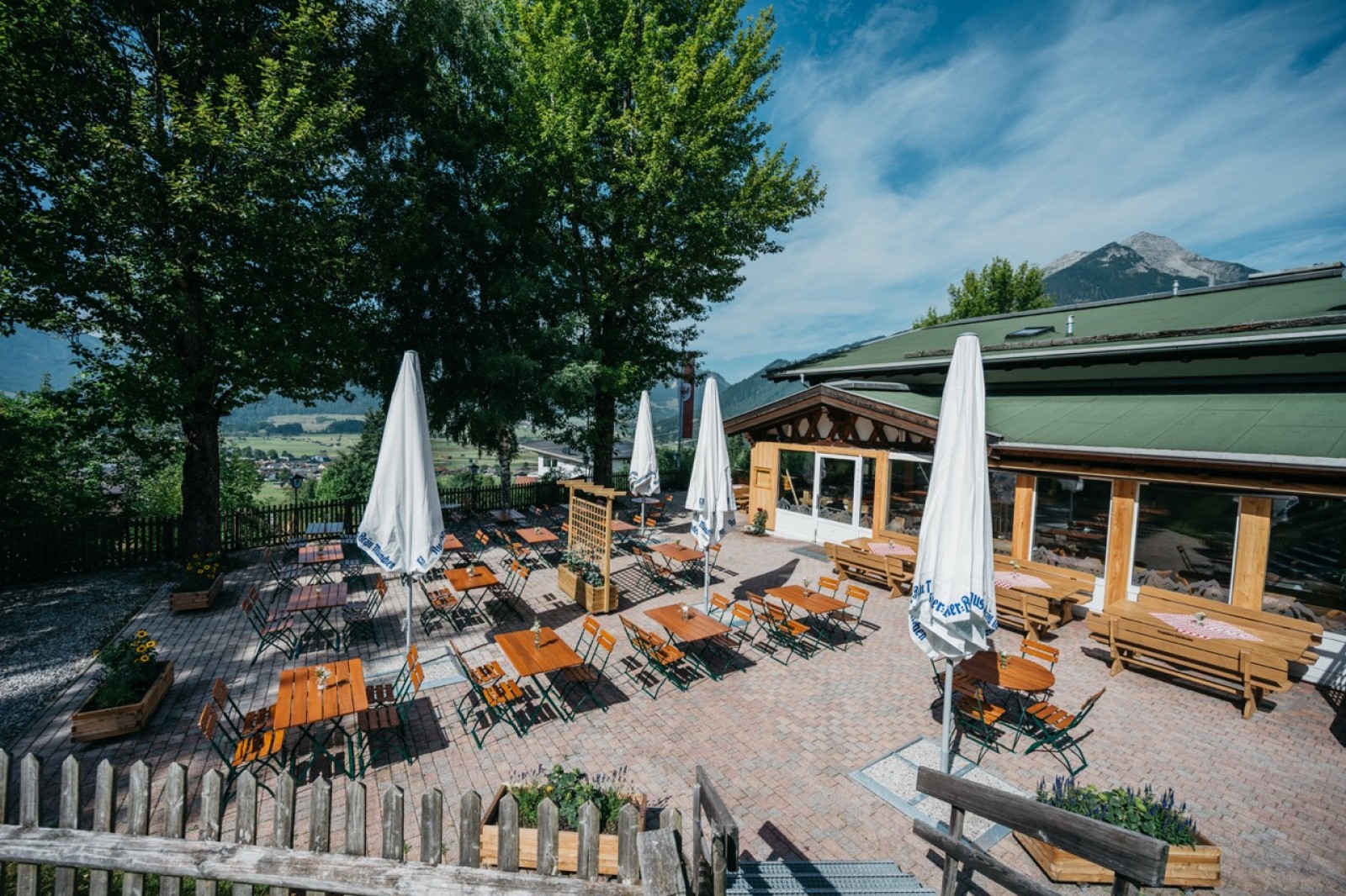 Die große Sonnenterrasse ist das Herzstück des Hauses. Hier öffnet sich der Blick auf die Zugspitze – ein Panorama, das man nicht vergisst. Genießen Sie Ihren Kaffee am Nachmittag, dazu feine Kuchen und Torten von unserer Konditorin, oder ein Glas Wein beim Sonnenuntergang – mit jedem Moment ein bisschen mehr Berggefühl.