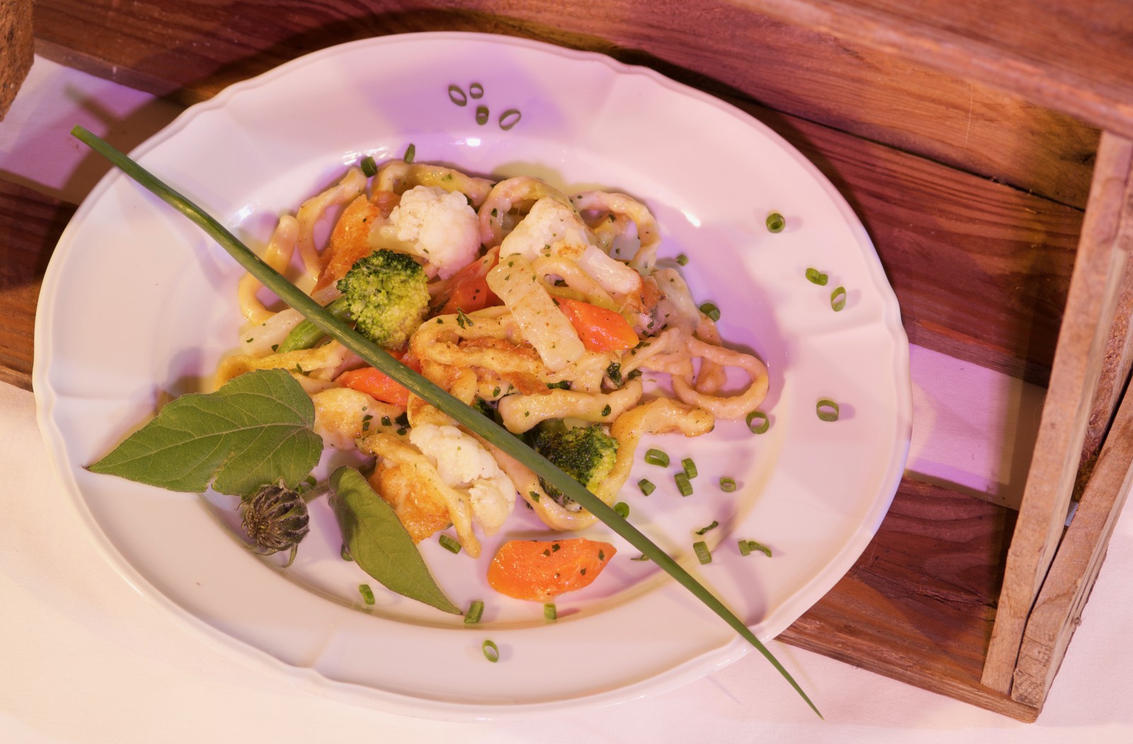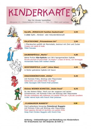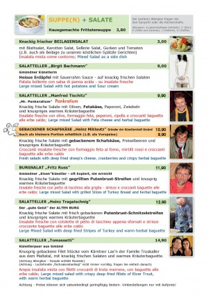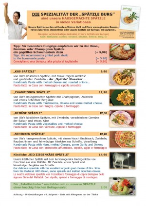 Sie kreiert in ihrer Burgküche mit viel Liebe und Herz die tollsten Versuchungen für jeden Geschmack. Die Spezialität des Hauses sind die hausgemachten original schwäbischen Spätzle, welche es bereits in über zehn verschiedenen Varianten, - ob mit Fleisch oder vegetarisch,- ja sogar glutenfrei (Lactosefrei) - gibt. Aber auch regionales,- wie den „Kärtna Lax´n“ gibt´s hier perfekt zubereitet, oder Blunz´n Gröstl, Biosulze mit knusprigen Bratkartoffeln, - Scampis auf Kräuterreis, Rumpsteaks - etc.. eben alles was das kulinarische Herz begehrt....