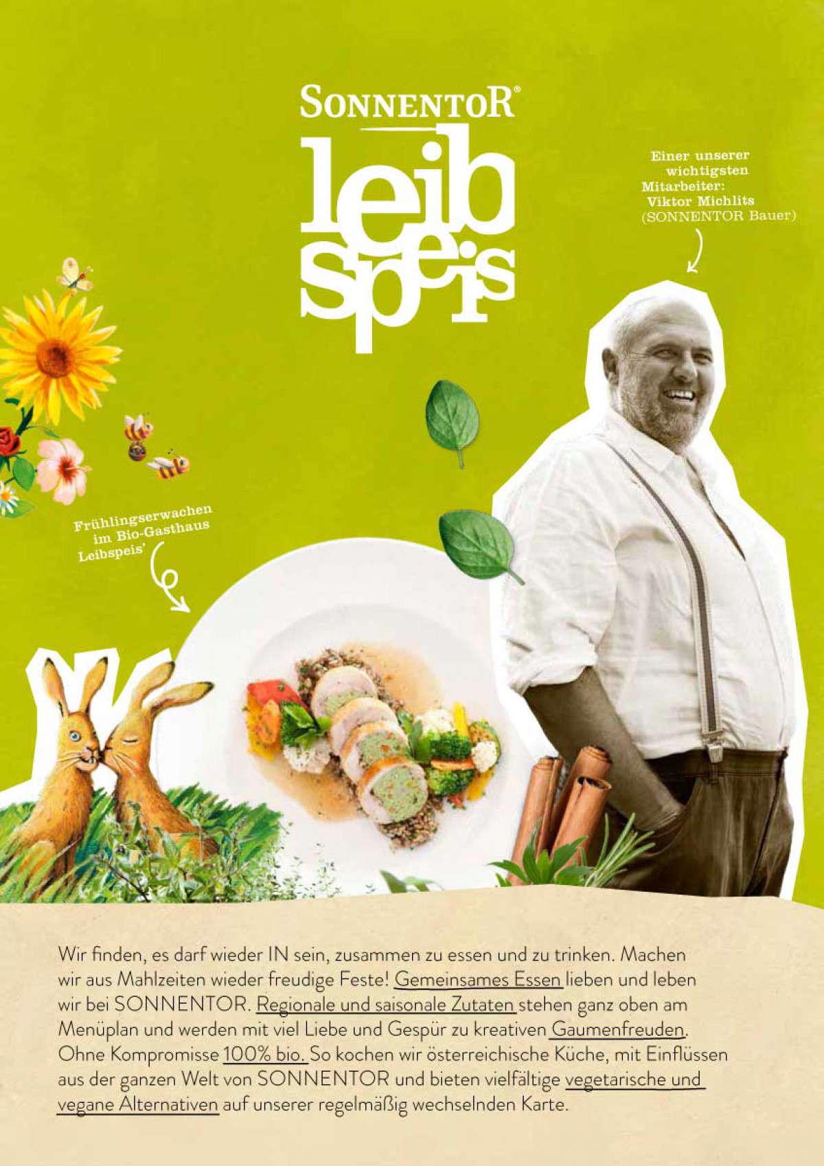 »Der Winterschlaf ist vorbei!« veröffentlicht am 22.03.2017 von SONNENTOR Bio-Gasthaus Leibspeis' in Sprögnitz ![]() ![]() Das SONNENTOR Bio-Gasthaus Leibspeis' erwacht aus dem Winterschlaf und öffnet ab dem 23. März für einen schwungvollen Start in die neue Saison. Erlebe die beliebten SONNENTOR Gewürze in ihrer natürlichen Umgebung und starte kraftvoll wie die Natur den Winter ablöst, energiegeladen in den Frühling. Bärlauch und Sprossen verfeinern die aktuelle Speisekarte, die mit Klassikern der österreichischen Küche ebenso gespickt ist, wie mit köstlichen vegetarischen und veganen Alternativen. Dabei bleibt das Wichtigste die Regionalität und Saisonalität der Speisen.