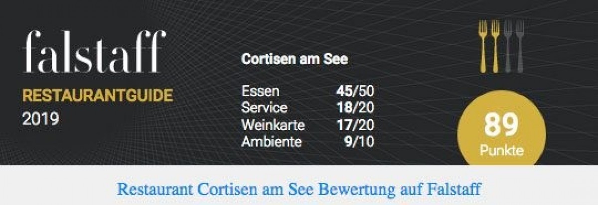 »Ein Punkt mehr für das CORTISEN-RESTAURANT!« veröffentlicht am 27.02.2019 von Hotel Cortisen am See in St. Wolfgang ![]() ![]() Jetzt mit 89 Punkten im FALSTAFF-Ranking. Eines der besten Restaurants in Oberösterreich. Wir danken unseren Teams in Küche und Service unter der Leitung unseres Küchenchefs Christian Eisl und Oberkellners Markus Schmaranzer. |