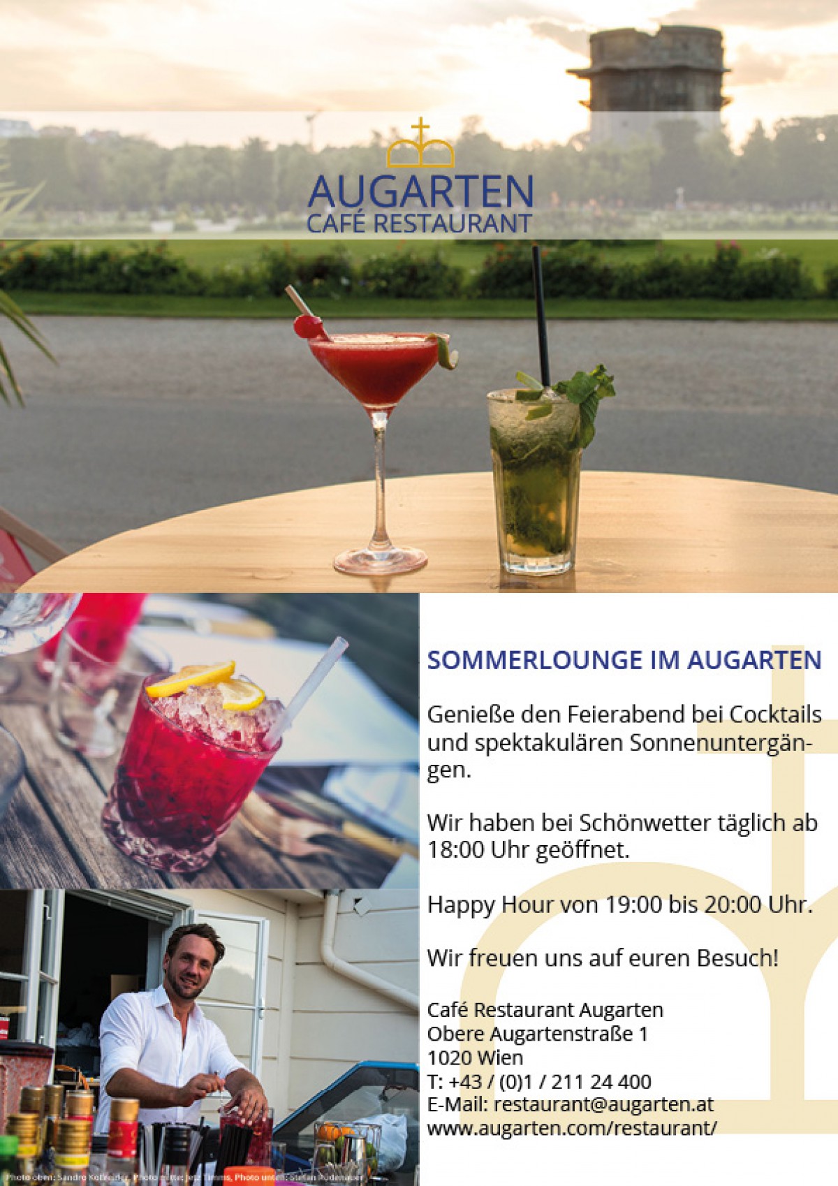 Wir haben bei Schönwetter täglich ab 18:00 Uhr geöffnet. Happy Hour von 19:00 bis 20:00 Uhr. Wir freuen uns auf euren Besuch! Café Restaurant Augarten Obere Augartenstraße 1 1020 Wien T: +43 / (0)1 / 211 24 400 E-Mail: restaurant@augarten.at www.augarten.com/restaurant/ |