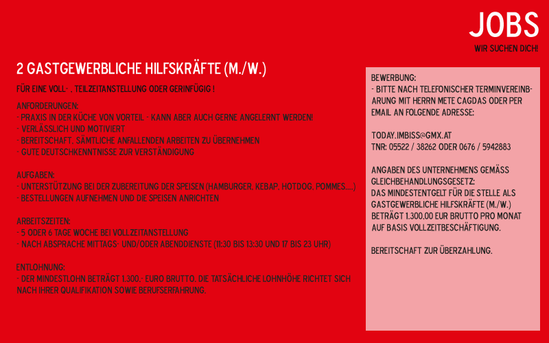 Aktuelle Stellenangebote von Today Imbiss ' Feldkirch am Bahnhof ' in Feldkirch |