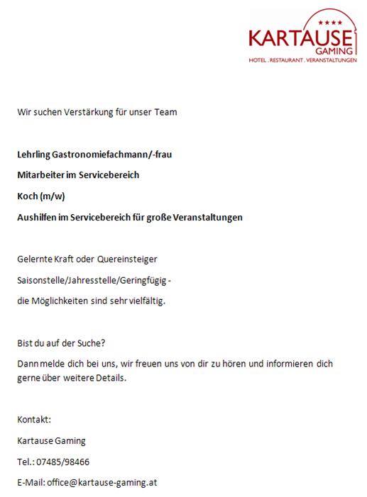 »Wir suchen Verstärkung für unser Team« eine Stellenausschreibung von Restaurant 'KARTAUSENKELLER' in Gaming ![]() Wir suchen Verstärkung für unser Team
