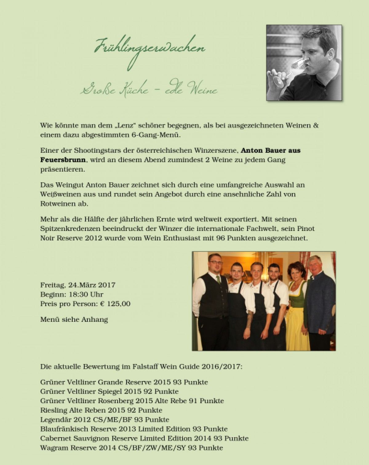 »Große Küche & Edle Weine« eine Veranstaltung von Landhaus Stift Ardagger in Ardagger Stift ![]() ![]() Degustationsmenü & Präsentation Weingut Anton Bauer