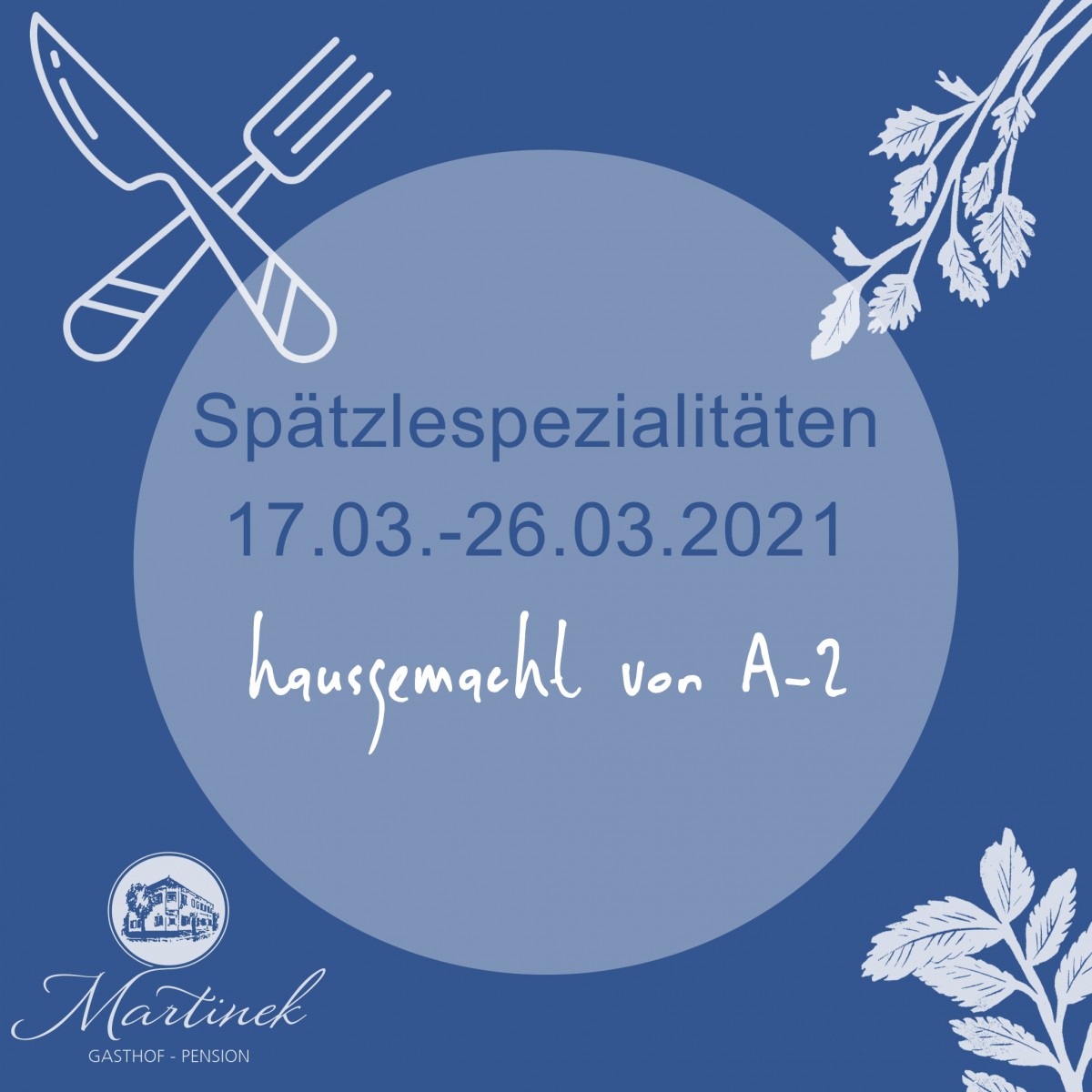»Spätzlespezialitäten« eine Veranstaltung von GASTHOF MARTINEK in BADEN ![]() Hausgemachte Spätzle in verschiedensten 'Farben' und Geschmacksrichtungen in der Zeit von 17.03.-26.03.2021.