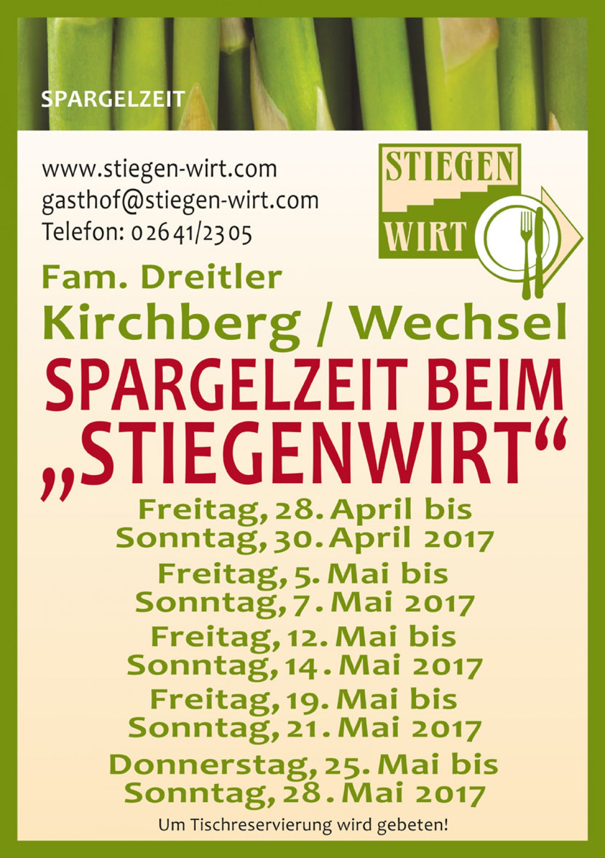 »Spargelspezialitäten« eine Veranstaltung von Gasthof Stiegenwirt in Kirchberg am Wechsel ![]() ![]() Biospargel mit regionalen uns saisonalen Zutaten