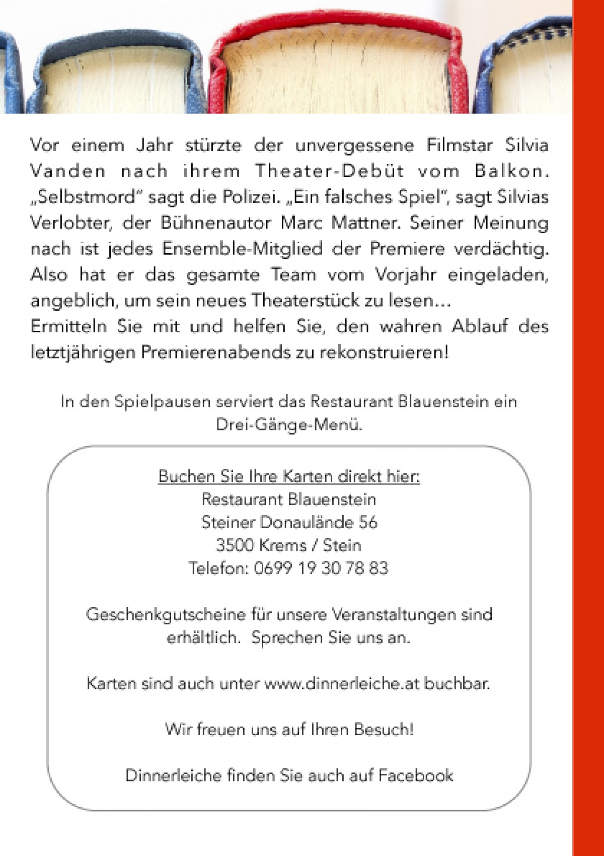 »Lesebrobe-Krimi-Dinner« eine Veranstaltung von Martin Blauensteiner GmbH in Krems/ Stein ![]() Es wird in unserem Veranstalltungssaal ein Mord gelöst.