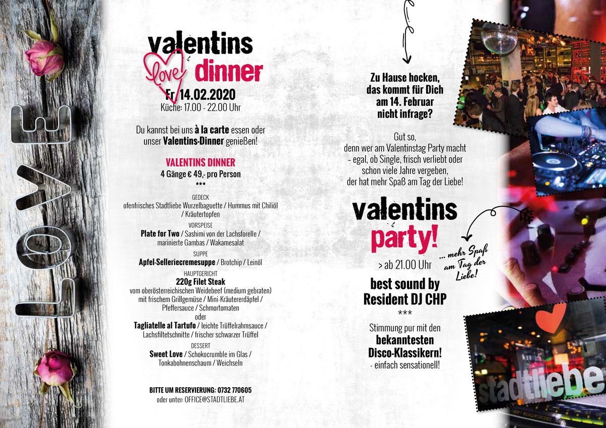 __________________ Fr, 14.02.2020 Küche: 17.00 - 22.00 Uhr Du kannst bei uns à la carte essen oder unser Valentins-Dinner genießen! VALENTINS DINNER 4 Gänge € 49,– pro Person *** GEDECK ofenfrisches Stadtliebe Wurzelbaguette / Hummus mit Chiliöl / Kräutertopfen VORSPEISE Plate for Two / Sashimi von der Lachsforelle / marinierte Gambas / Wakamesalat SUPPE Apfel-Selleriecremesuppe / Brotchip / Leinöl HAUPTGERICHT 220g Filet Steak vom oberösterreichischen Weidebeef (medium gebraten) mit frischem Grillgemüse / Mini-Kräutererdäpfel / Pfeffersauce / Schmortomaten oder Tagliatelle al Tartufo / leichte Trüffelrahmsauce / Lachsfiltetschnitte / frischer schwarzer Trüffel DESSERT Sweet Love / Schokocrumble im Glas / Tonkabohnenschaum / Weichseln BITTE UM RESERVIERUNG: 0732 770605 oder unter: OFFICE@STADTLIEBE.AT __________________ Zu Hause hocken, das kommt für Dich am 14. Februar nicht infrage? Gut so, denn wer am Valentinstag Party macht – egal, ob Single, frisch verliebt oder schon viele Jahre vergeben, der hat mehr Spaß am Tag der Liebe! VALENTINS party! > ab 21.00 Uhr best sound by Resident DJ CHP *** Stimmung pur mit den bekanntesten Disco-Klassikern! - einfach sensationell!