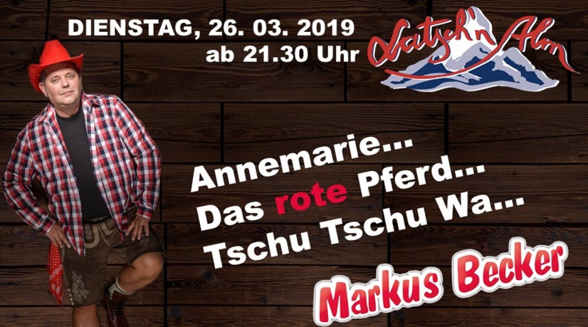 » Markus Becker LIVE in der Latschn Alm« eine Veranstaltung von Latschn Alm in Obertauern ![]() ![]() Bei uns zu Gast in der Latsch´n Alm: Markus Becker mit seinen Hits 'Annemarie', 'Das rote Pferd', 'Die schönste Frau der Welt', uvm. ab 21.30 Uhr. Vor und nach dem Auftritt sorgt DjBambo für grandiose Partystimmung! 💃🕺💃