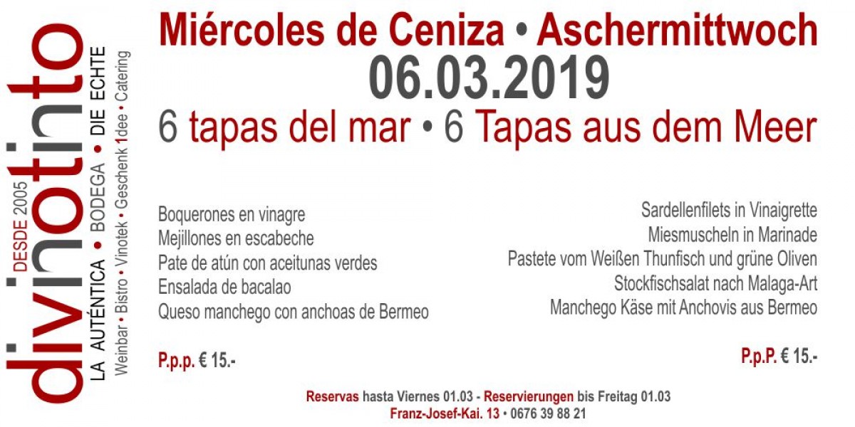 »Aschermittwoch« eine Veranstaltung von Divinotinto in Salzburg ![]() ![]() 6 Tapas aus dem Meer • € 15.-