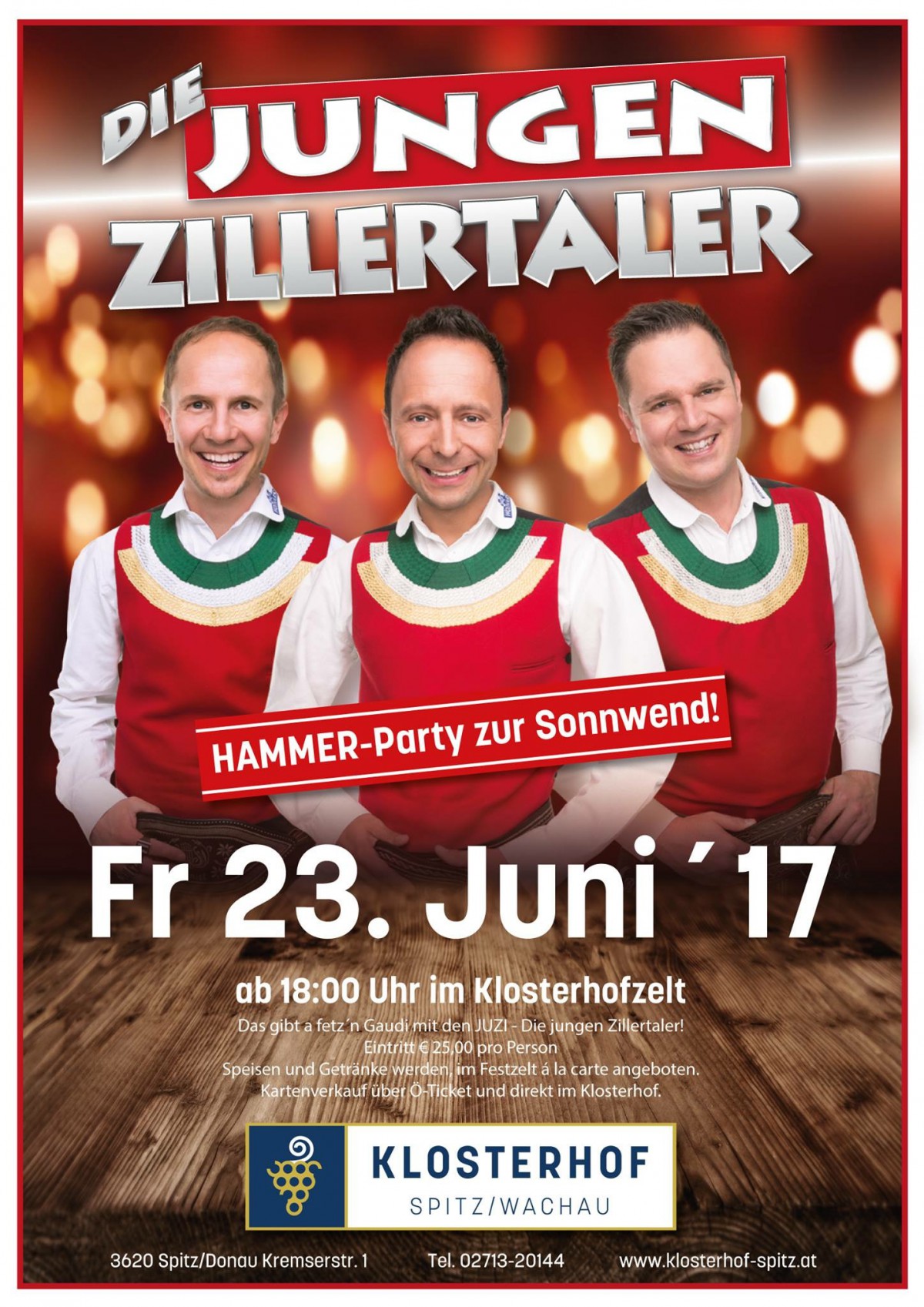 Das gibt a fetzn Gaudi mit den JUZI 'Jungen Zillertalern' Eintritt: € 25,00 pro Person Speisen und Getränke werden im Festzelt a la carte angeboten. Karteverkauf über Ö-Ticket und direkt im Klosterhof.