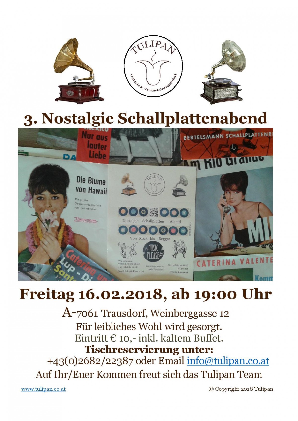 »3. Nostalgieschallplattenabend« eine Veranstaltung von Tulipan Galerie & Veranstaltungslokal in Trausdorf an der Wulka ![]() ![]() Bereits zum 3. mal organisiert Tulipan einen gemütlichen Nostalgie Schallplattenabend - von Rock bis Reggae, mit Schallplatten aus den 50-er, 60-er, 70-er und 80-er Jahren. Die Gäste haben die Möglichkeit aus dem verfügbaren Sortiment sich Musikwünsche auszusuchen und Tanzbein zu schwingen. Für leibliches Wohl ist gesorgt. Wir bitten um Tischreservierungen unter: 0268222387. Auf Euer kommen freut sich das Tulipan Team!