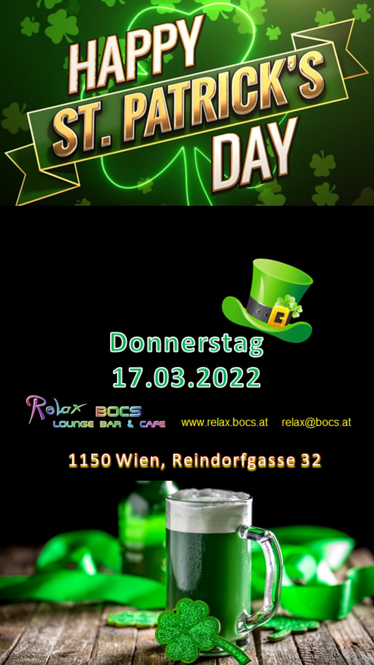 »St. Patrick's Day in der Relax BOCS« eine Veranstaltung von Relax BOCS Lounge Bar & Cafe in Wien ![]() mit grünem Bier