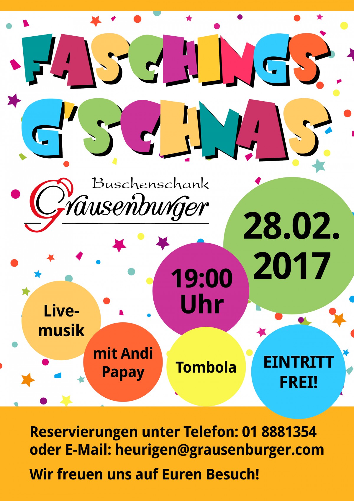 »FASCHINGS G´SCHNAS« eine Veranstaltung von Buschenschank Grausenburger in Wien ![]() ![]() Wie jedes Jahr findet am Faschingsdienstag unser Faschingsg'schnas statt. Ein buntes Fest mit Livemusik, Tanz, Tombola und vielem mehr!