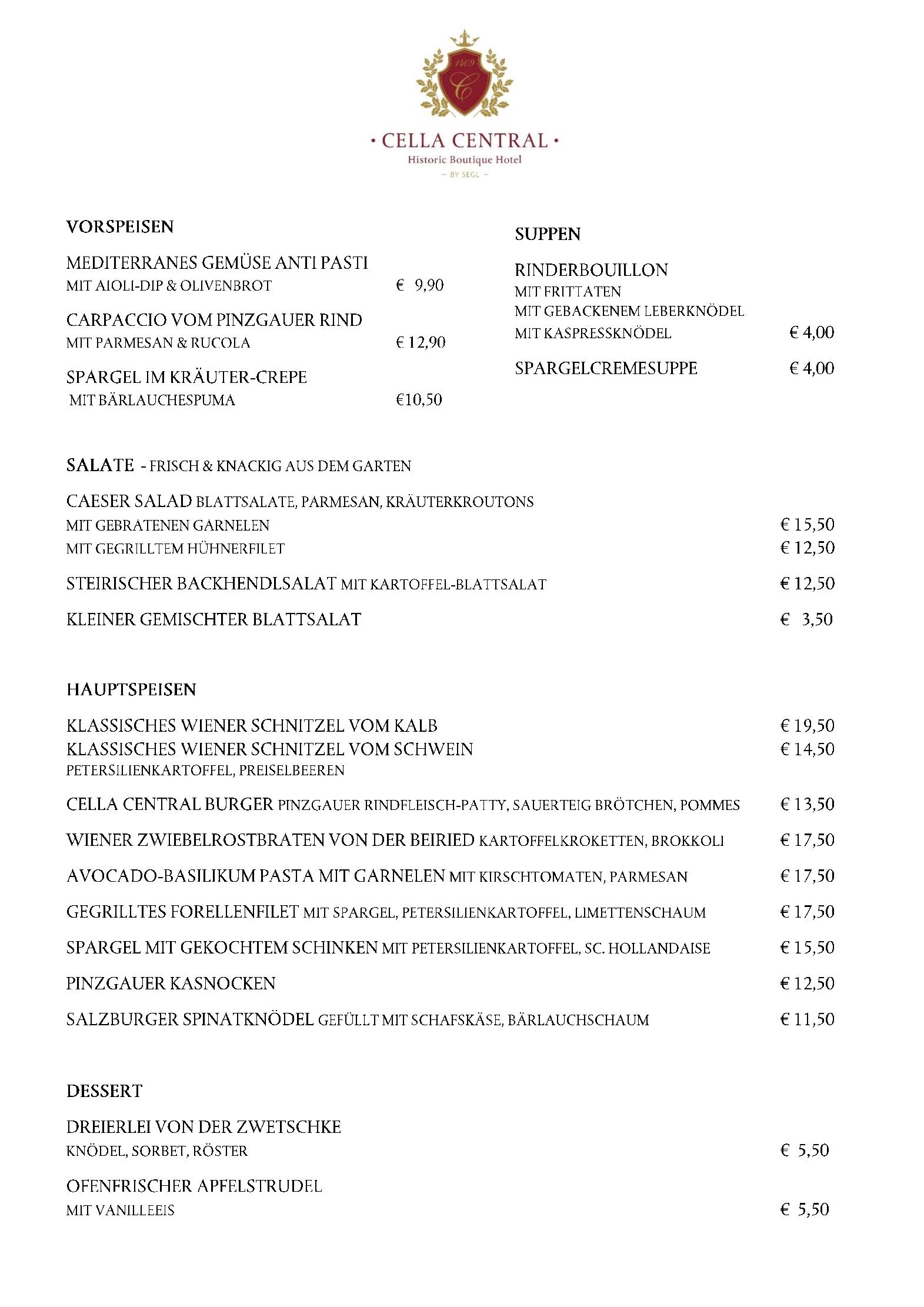 Download der Speisekarte des Restaurant Cella Central  in Zell am See im PDF-Format