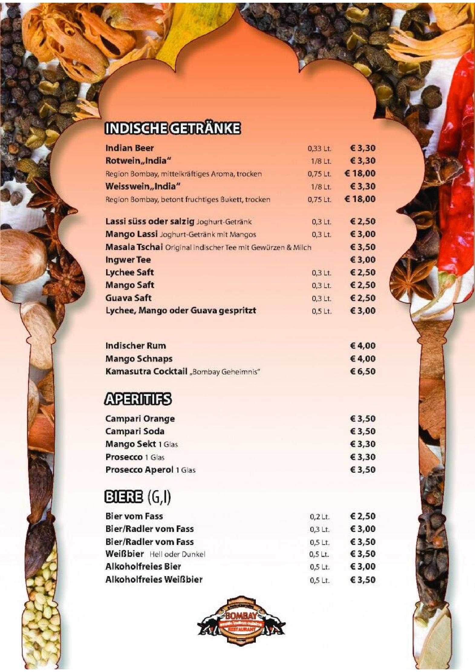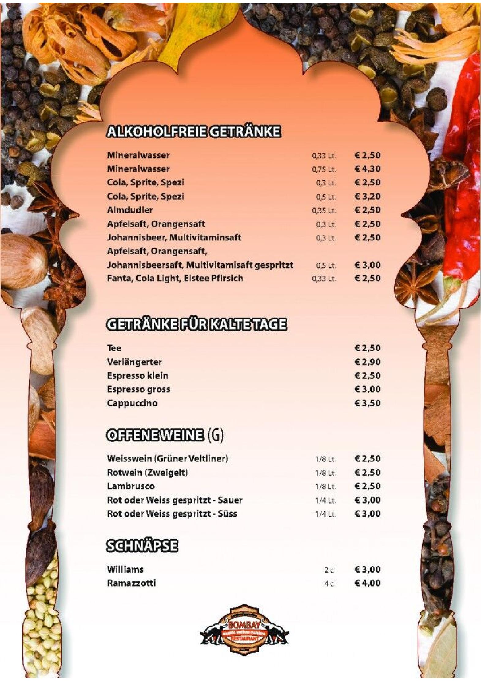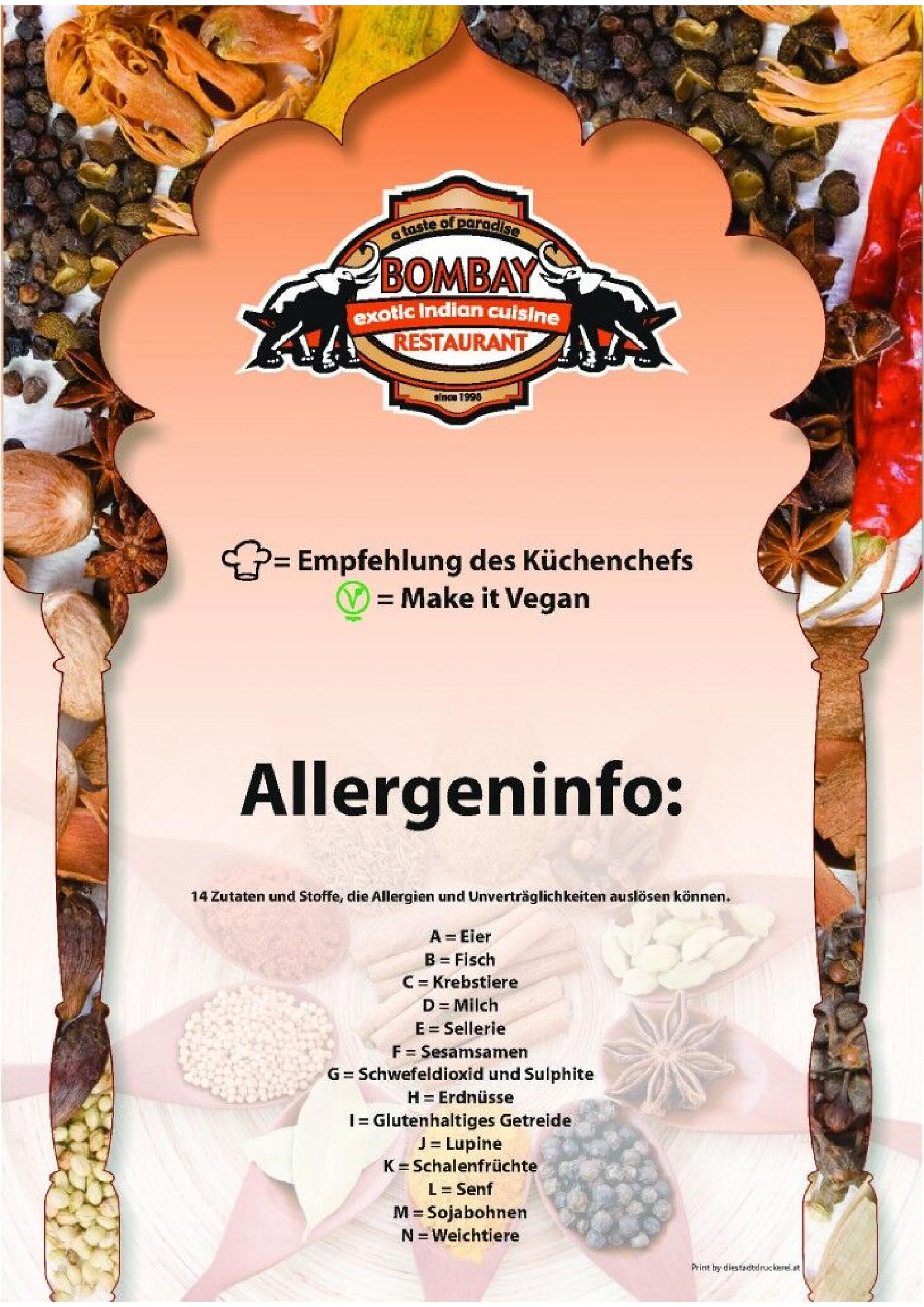 Download der Speisekarte des Bombay Restaurants in Kufstein im PDF-Format