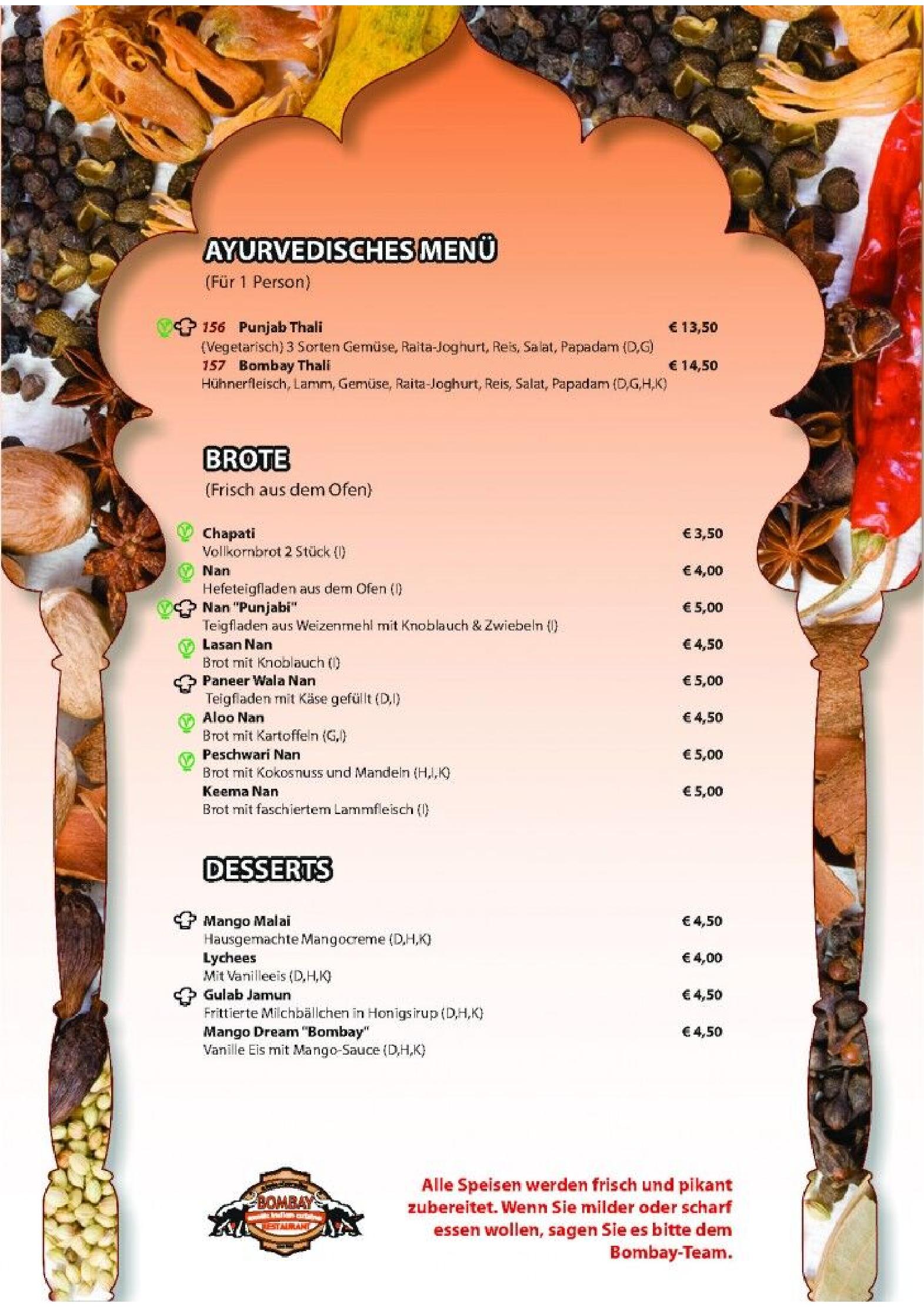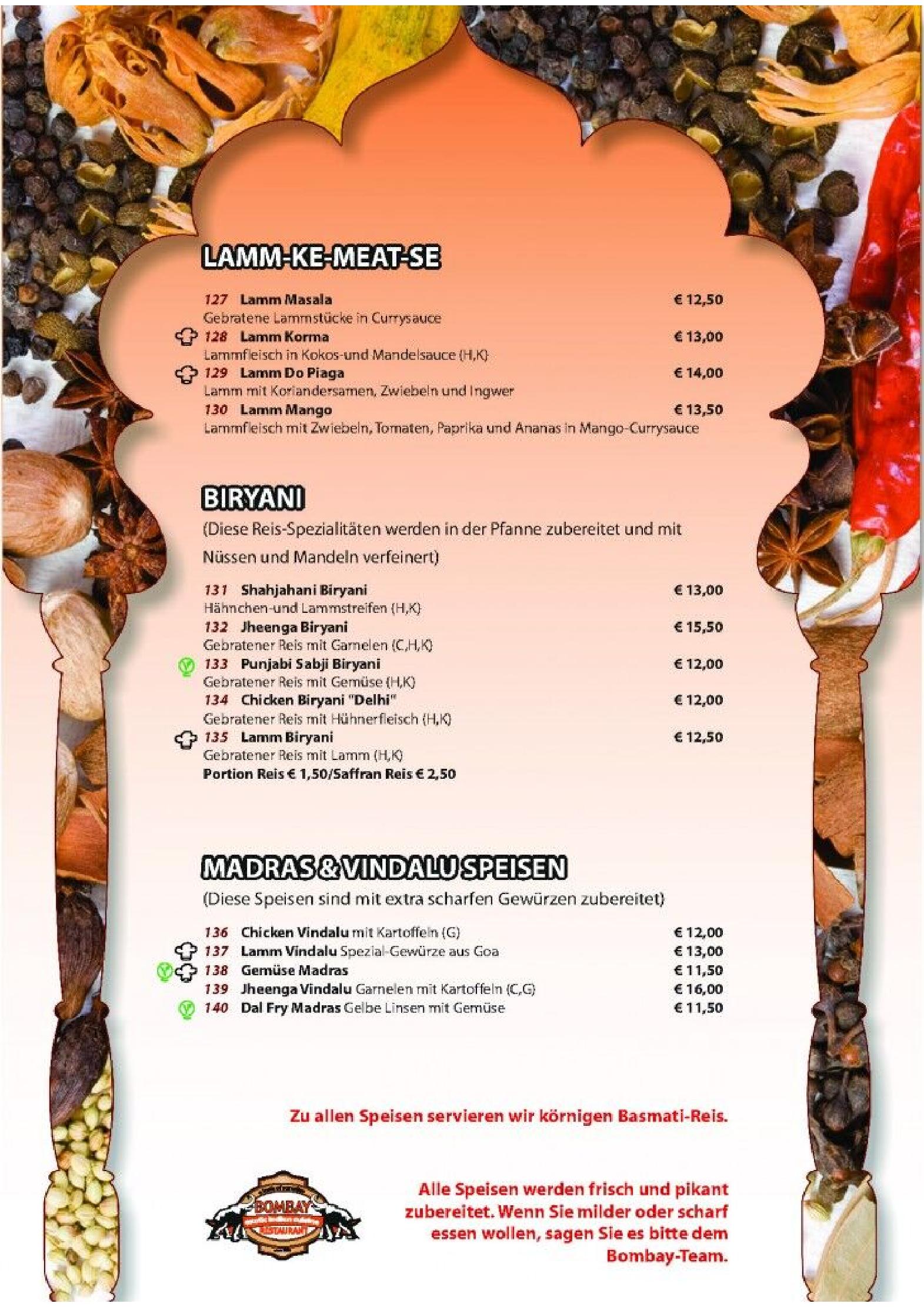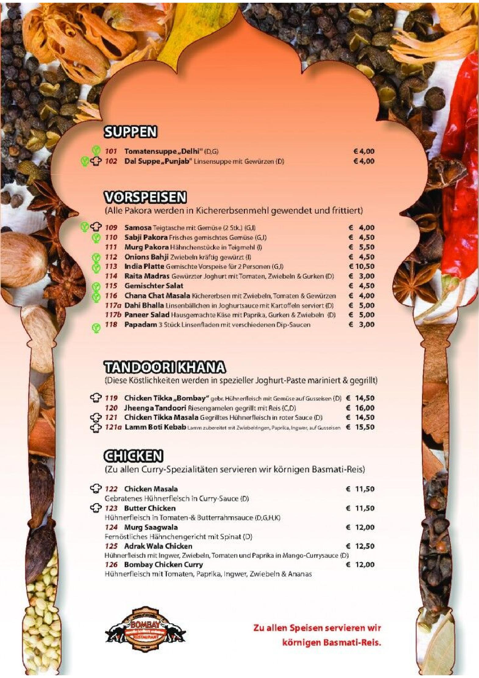 Download der Speisekarte des Bombay Restaurants in Kufstein im PDF-Format