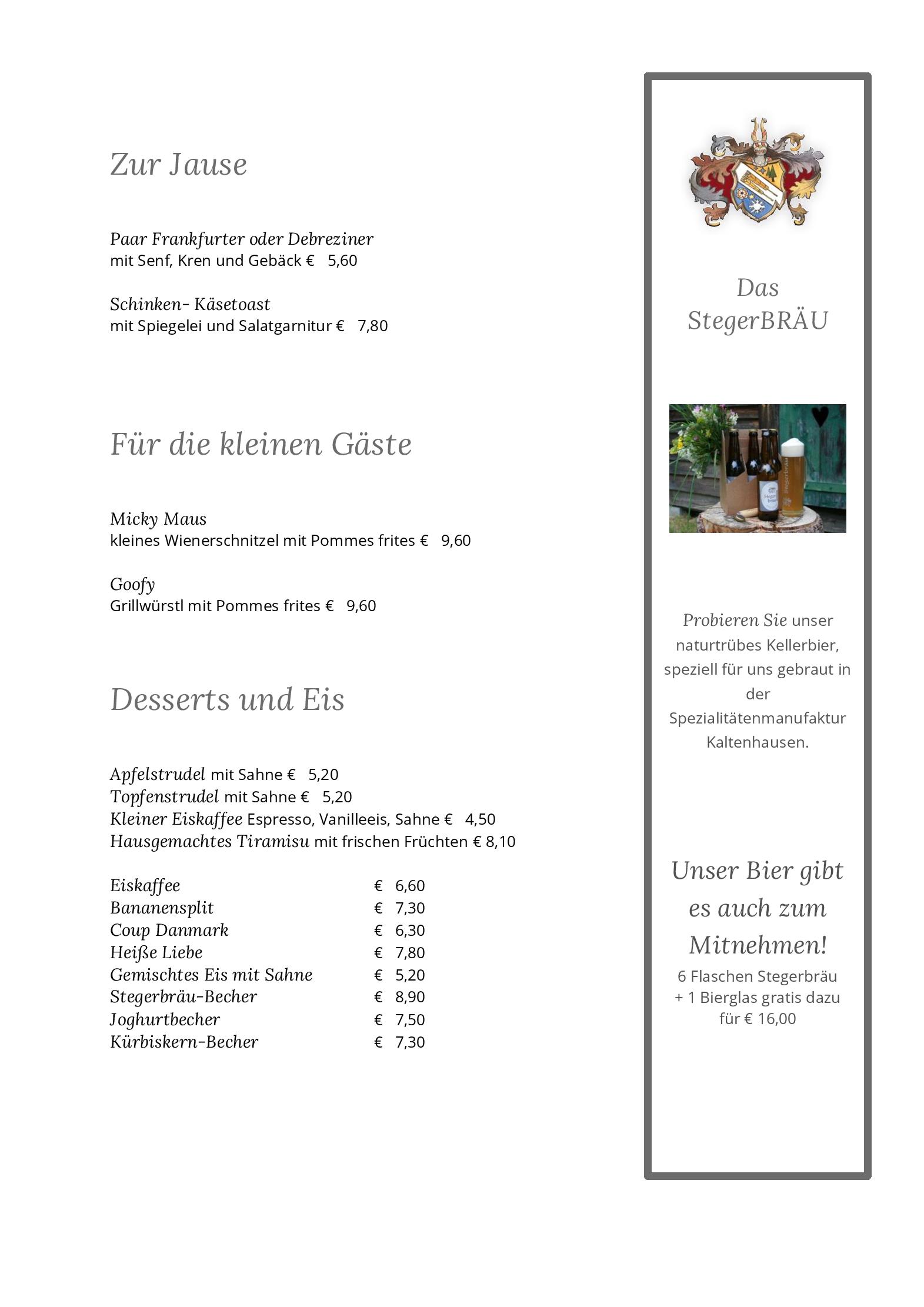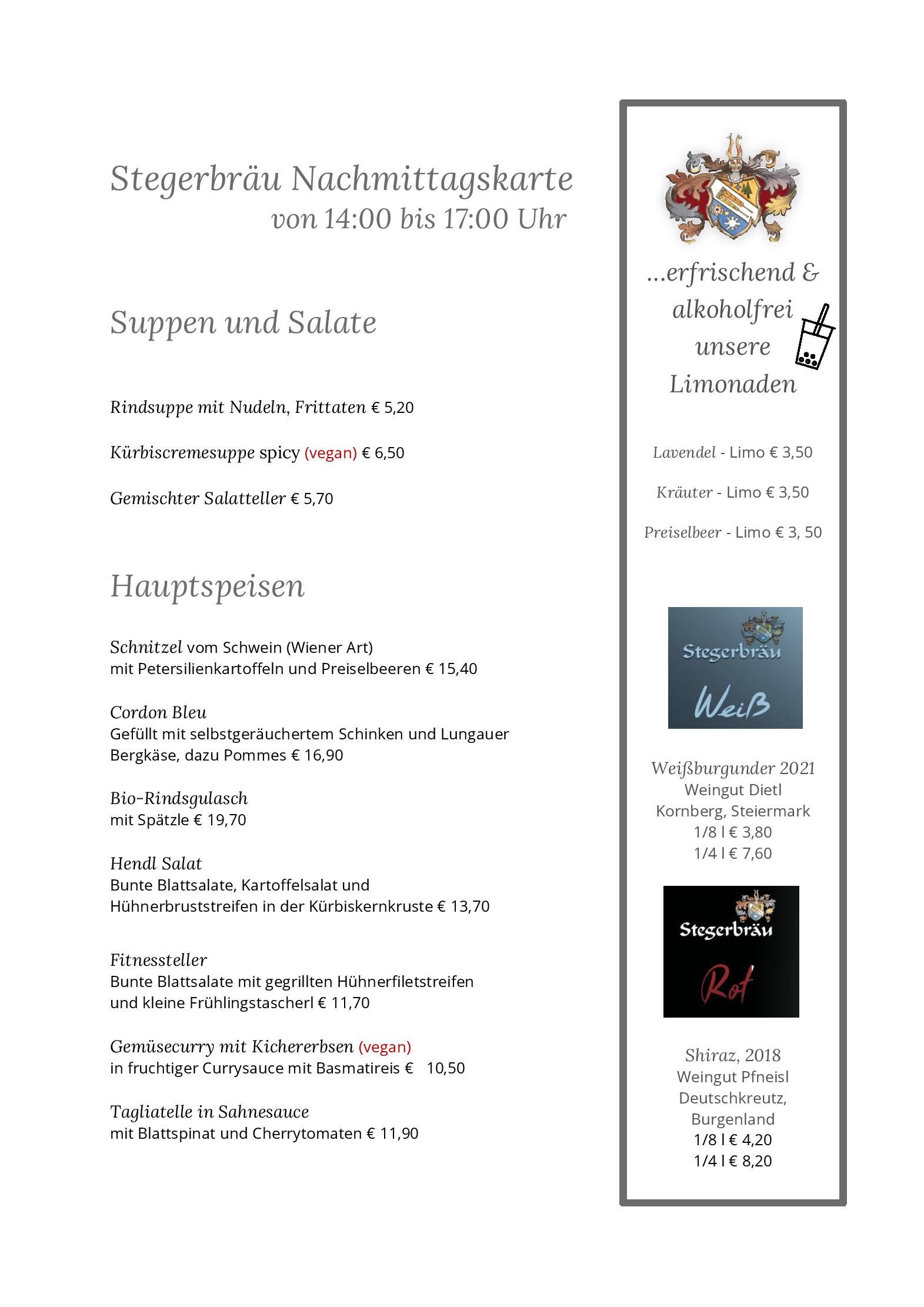 Download der Speisekarte des Restaurant Stegerbru  in Radstadt im PDF-Format