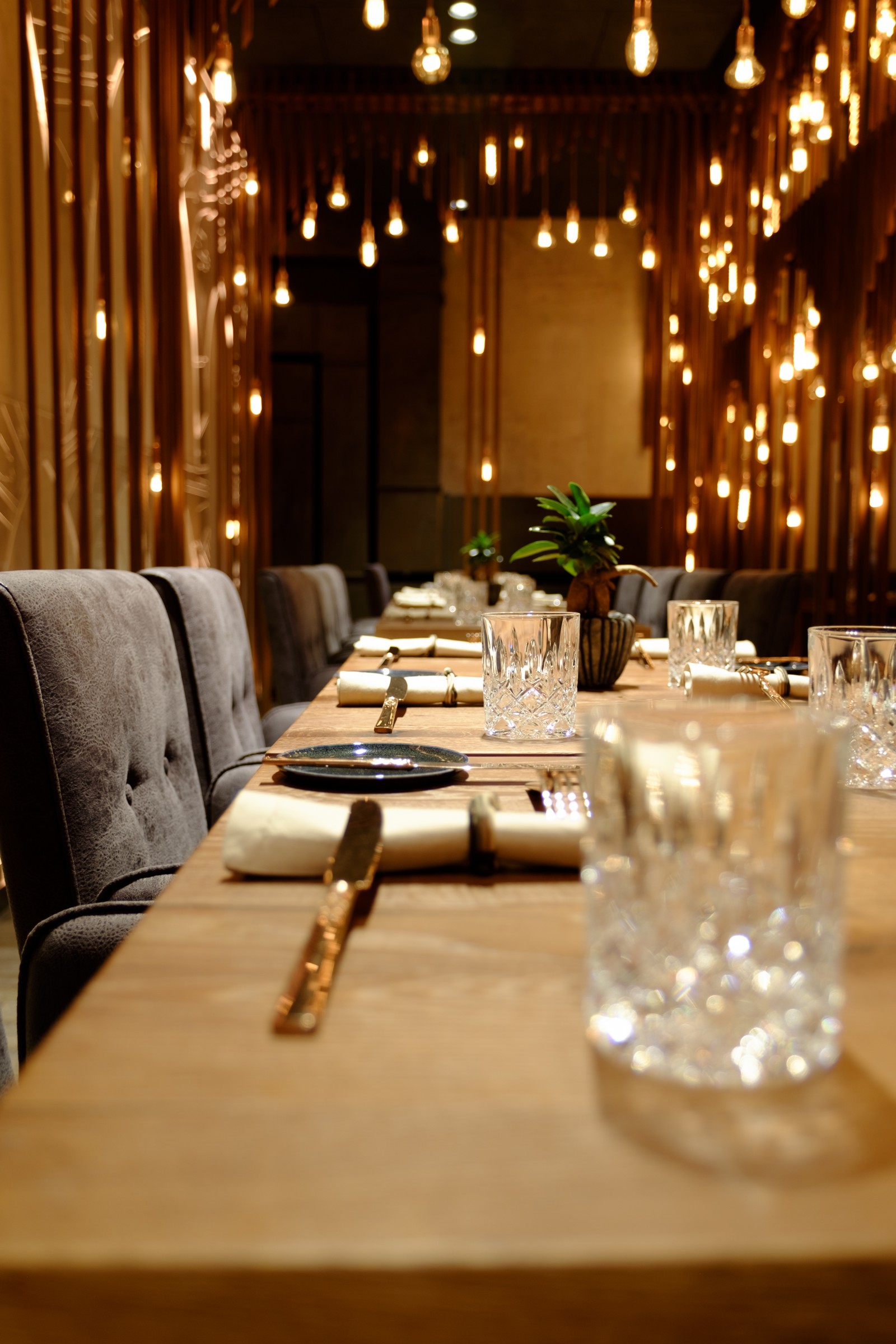 Das Blue Mustard überrascht zusätzlich mit außergewöhnlichem Design: Eine beeindruckende Lightshow, ein „Iron Curtain“, insgesamt über 600 Glühbirnen im ganzen Lokal...
