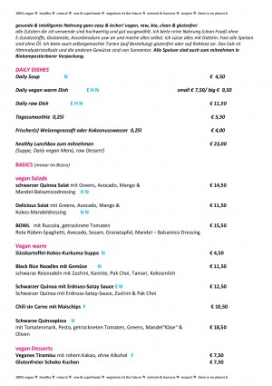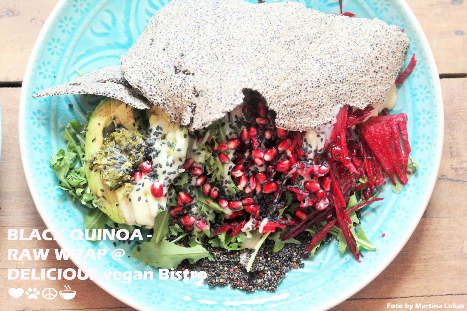 Im Delicious gibt es kreative & ausgefallene Speisen wie zb schwarze Rohkost Quinoawraps mit rote Rüben Spaghetti, Bowls, black Rice Noodles, schwarzer Quinoa mit Erdnusscreme & Pak Choi, Rohkost- oder schwarze Quinoapizza, Konjaknudeln, Rawmisu, Delicious Salat mit Rucola, Mango, Kokos, Avocado & Mandel-Balsamicodressing, gesüsst wird mit Datteln und es wird kaum Öl verwendet.
